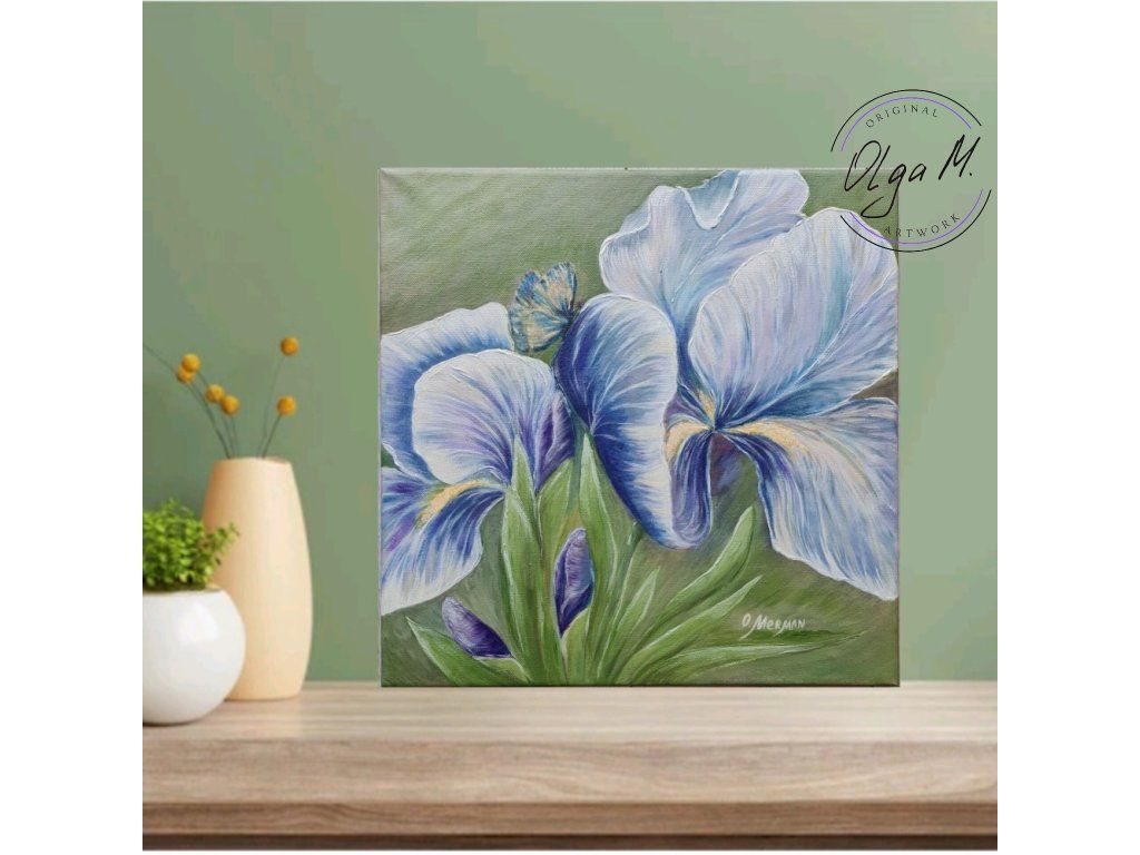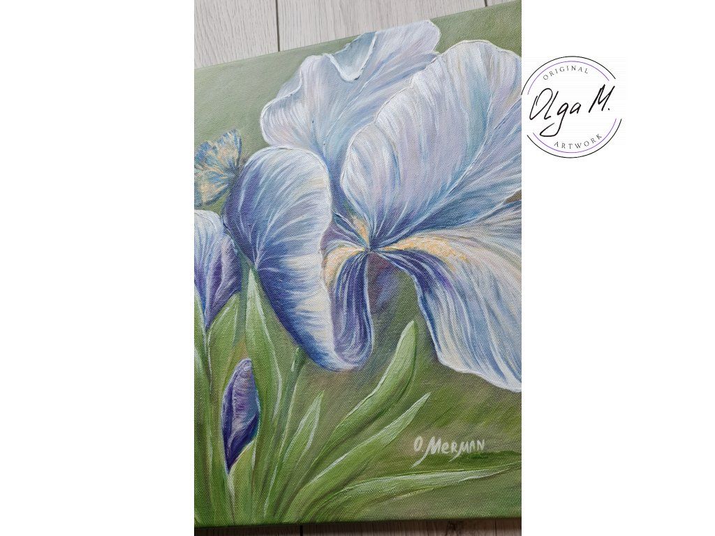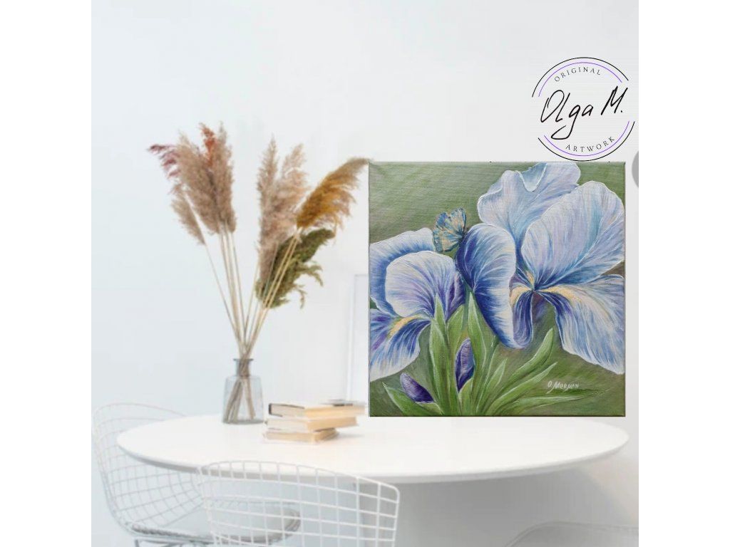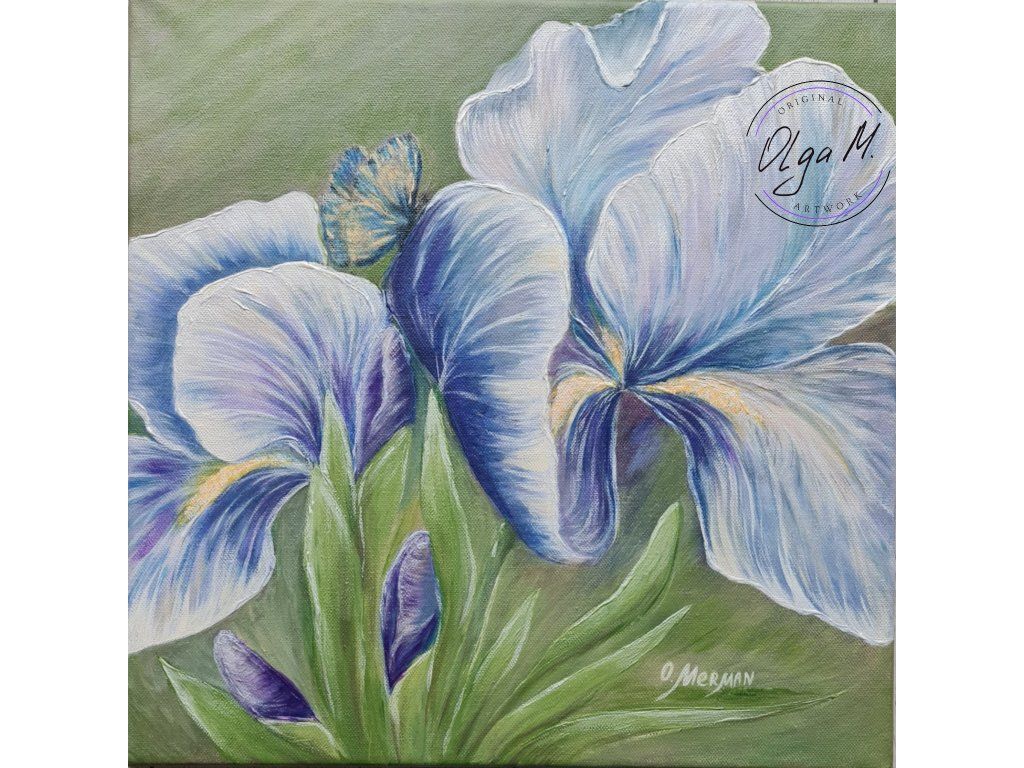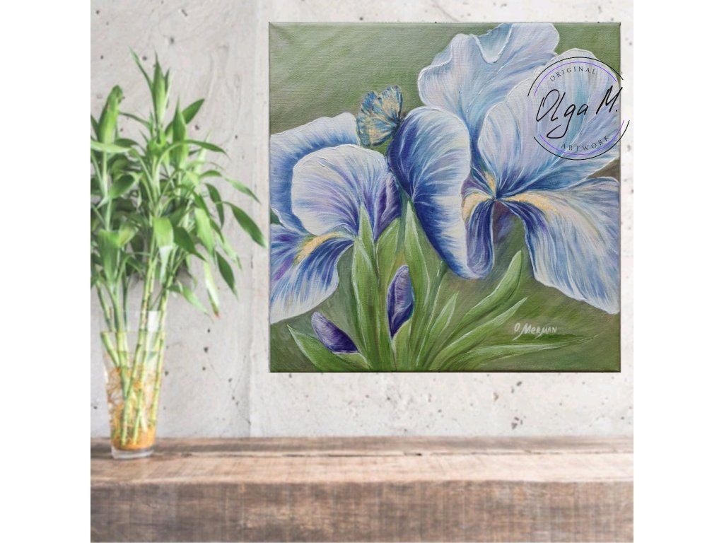 #obraz #umeni #akrilovyobraz #kvetiny #kosatce #motyl #motylek #priroda #leto #iris #art #originalartwork #acrylicpainting #summer #butterfly #greenandblue #painting #flowers