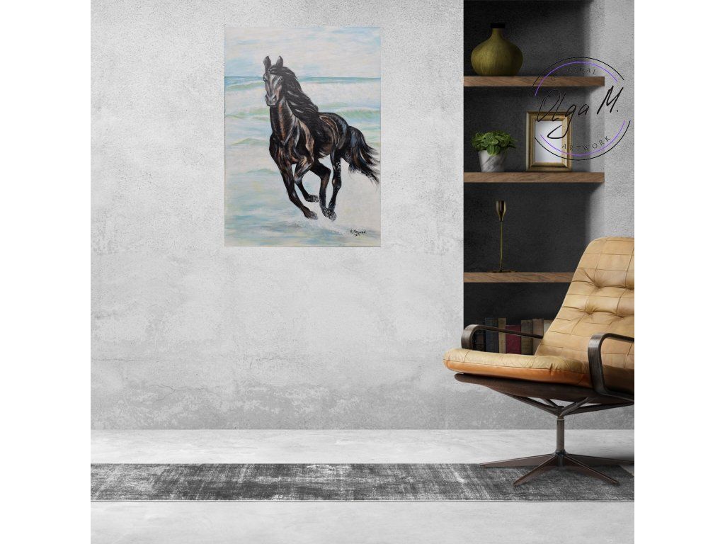 Černý kůň běžící po písčité pláži do čerstvého větru, žádná překážka, nic mu nebrání v cestě, je sám sebou a nic nemusí předstírat. Tento obraz znázorňuje především emocionální svobodu a spojené s tím pocity radosti, štěstí a uvolnění.